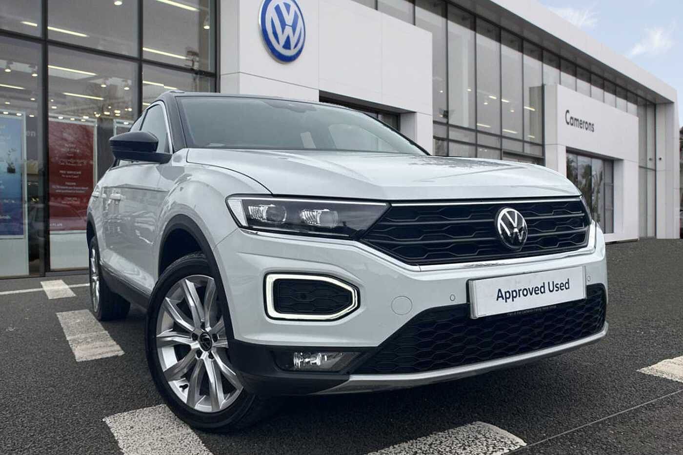 Exterior Features, Solid paint, Two tone - Black roof, A pillar and mirror housing, Safety, Ultrasonic front and rear optical and audible parking sensors, Interior Features, Gem cloth upholstery, Packs, Sport pack with caribou grey decorative inserts - T-Roc, Paint - Special, Special solid - Pure white, Wheels, Steel space saver spare wheel including tool kit and jack, Exterior Features, Front and rear electric windows, Front windscreen wiper with intermittent wipe and 4 position delay, Heated rear window, Rain sensor, Rear tinted glass from B-pillar backwards approx 65% tinted, Rear wash/wipe with intermittent wipe setting, Black grained lower door protectors, Black grained wheel arches, Body colour bumpers with silver metallic underbody fascia, Body colour door handles, Chrome effect left and right trapezoid exhaust tailpipe fascia surround, Chrome trim on upper and lower radiator grille, Fully galvanised body, Volkswagen roundel, Automatic hazard lights activation under emergency braking, Dusk sensor, Front fog lights with static cornering function, High level 3rd brake light, LED darkened rear light clusters, LED dipped and main beam headlights with automatic range adjustment including signature LED daytime running lights, LED rear number plate lights, Manual coming/automatic leaving home lighting function, Safety, ABS, Electronic parking brake with auto hold, Electronic stability control (ESC) includes ASR, EDL, EDTC and trailer stabilisation function, Ventilated front and rear disc brakes, Volkswagen roadside assistance, Adaptive cruise control with front assist, radar sensor controlled distance monitoring, city emergency braking, Driver alert system with audible and visual fatigue detection system, Lane assist with warning text instrument cluster, Modified key software - reduce switch off time for key status change to Long no motion, Auto dimming interior rear view mirror, Electrically foldable, adjustable and heated door mirrors with puddle lights and reverse activated kerb-view adjustment on passenger's door mirror, 3 rear three point seatbelts, Curtain airbags, Driver and front passenger safety-optimised head restraints, Drivers and front passengers airbags with passengers deactivation switch, Drivers seatbelt reminder, Front seat side impact airbags, Predictive pedestrian protection, Rigid safety cell with front and rear crumple zones, Three point height adjust front seatbelts + pretensioners, Tyre pressure loss indicator, Audio / Communications, Bluetooth telephone and audio connection for compatible devices, Voice activation, Wireless app connect for apple carPlay, Centre arm rest including USB type C interface and USB charging socket, DAB Digital radio, Diversity antenna for FM reception, Front USB type C Interface 2X and USB charging socket, Music playback - MP3, WMA and AAC files, Premium USB cable in choice of either Apple or Android smartphone compatibility, SD card slot, Simultaneous pairing of 2 compatible mobile devices, SMS functionality - read, compose and send SMS messages using touch-screen display, Storage compartment with longitudinal and height adjustable in armrest and two rear air vents, Three route options - Fast, Short, Eco, Title and cover art display, Driver Convenience, Automatic start/stop system, Miscellaneous, 'Lights On' Reminder warning buzzer, Car information display, Digital Cockpit Pro - Active info display, Discover navigation including 8" touch screen display, streaming and internet, Driver tips and journey analysis, Multifunction computer with visual gear change recommendation for fuel consumption, Service interval indicator, Think blue trainer driver tips and journey analysis, Battery regeneration during braking, Interior Features, Climate control - 2 zone electronic air conditioning with automatic air recirculation and allergy filter, 4 load lashing points in luggage compartment, Branded points of interest, Drawer under drivers seat, Front cupholders x 2, Glov